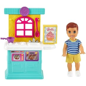 PRODUTO INTERNACIONAL. PRODUTO INTERNACIONAL. Bonecas e brinquedos da Barbie Skipper Babysitters Inc. permitem que as crianças explorem seu lado nutritivo como a babá - este conjunto foi projetado para provocar contação de histórias com uma pequena boneca infantil para cuidar e um playset de cozinha do seu tamanho que ajudará as crianças a cozinhar todos os tipos de diversão! A peça de cozinha colorida tem pia, fogão, forno, janela e muito mais! Ele vem com uma caixa de "Mix de cupcakes Barbie", colher e tigela para ainda mais inspiração – além disso, um design plug-and-play para segurar os itens. Algumas das peças têm uma alça que a boneca pode segurar para a diversão do role-play. As crianças podem coletar todas as bonecas e brinquedos Barbie Skipper Babysitters Inc. para explorar ainda mais as possibilidades de role-play e storytelling (cada um vendido separadamente, sujeito à disponibilidade). Inclui boneca infantil pequena, peça de cozinha e três acessórios. A boneca não pode ficar sozinha. As cores e decorações podem variar.