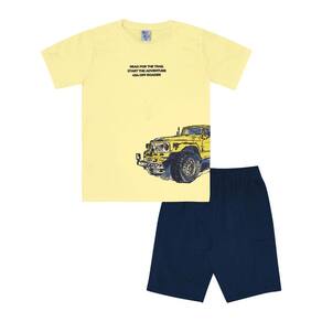 Conjunto Trilha é ideal para os meninos que gostam de conforto e estilo! Com a camiseta confeccionada em tecido meia malha na cor amarela, ela possuí estampa frontal com jeep de trilha e escrita "Pronto para trilha comece a aventura 4x4 fora da estrada" e a bermuda de moletom na cor marinho.