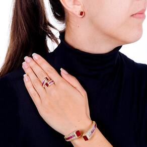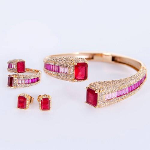 Conjunto de anel, bracelete e brincos, banhado a ouro com aplicação de baguetes coloridas, microzircônias cristais e pedras fusion safira, é um conjunto luxuoso que te deixa em destaque em qualquer situação.