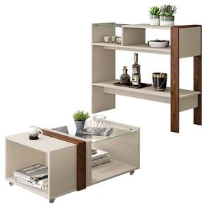 - Aparador, Possui 2 Prateleiras sendo 1 em vidro - Aparador, Possui 1 Nicho - Mesa, Possui 4 Rodízios para melhor deslocamento - Mesa, Possui 1 Prateleira e 1 Nicho