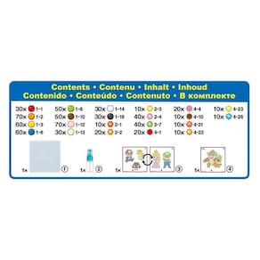 O conjunto de personagens do Super Mario inclui mais de 690 contas sólidas, joias e estrelas em 22 cores, bandeja de layout, pulverizador, folhas de modelo e instruções.