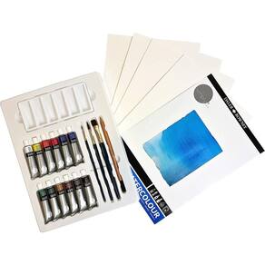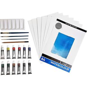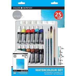 O conjunto Daler Rowney simply® inclui 25 peças para dar asas á sua imaginação com materiais de elevada qualidade. Caso seja experiente ou esteja apenas agora a dar os primeiros passos, este conjunto é para si. Contém 12 tubos de tinta aguarela, 3 pincéis, um lápis e 8 folhas A4 para aquarela.