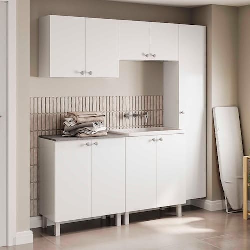 O Conjunto Multiuso para lavanderia ou área de serviço, da linha Duo, é perfeito para quem busca mais organização e um belo visual no ambiente. Ele é composto por dois armários aéreos, um armário multiuso e dois balcões. Os aéreos contam com ótimo espaço interno, um deles possui prateleira, garantindo o armazenamento de seus produtos de limpeza e itens de arrumação com muita acessibilidade. O multiuso possui uma porta única, que oferece fácil acesso ao interior do móvel, uma prateleira e gancho para a acomodação de vassoura ou rodo. Já os balcões contam com prateleiras internas e tampos em estilo concreto BP. A qualidade dessas peças são um diferencial: a caixaria é produzida em um aço que passa por rigoroso processo de pintura eletrostática e anticorrosiva, resultando em um acabamento brilhoso e garante durabilidade e portas em MDP, material de excelente durabilidade e muito fácil de limpar. Essa combinação de materiais é perfeita para trazer resistência aos móveis dispostos em uma área que sofre com intempéries como vento, umidade e água, como a lavanderia. Com a linha Duo, a sua casa fica muito mais funcional e bonita.