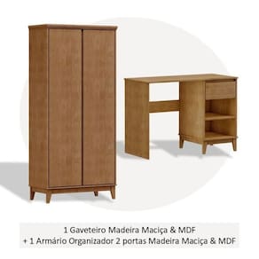 O conjunto da Linha Prata da Finestra, formado pelo Armário Organizador 2 Portas e pela Escrivaninha 1 Gaveta, é ideal para escritório ou home office, unindo organização, funcionalidade e estilo. Produzidos em madeira maciça e MDF com acabamento em verniz acetinado PU/UV, garantem durabilidade e sofisticação. A escrivaninha oferece gaveta prática para materiais de trabalho ou estudo, enquanto o armário organiza documentos, pastas e objetos essenciais, mantendo o ambiente limpo e funcional. Ideal para quem busca móveis modernos, versáteis e com design refinado, transformando seu espaço de trabalho em um ambiente elegante e organizado. Suporta Até (kg): 50 kg Acabamento: Pintura UV Altura do Conjunto: 179 cm Ambiente: null Ambiente Principal: Escritório Cor: Freijó Informação Complementar: 1x Armário Organizador 2 Portas MDF e Madeira Maciça Linha Prata Freijó Largura: 82,5 cm Altura: 179 cm Peso: 52 kg Profundidade: 40,5 cm Necessita Montagem: Sim