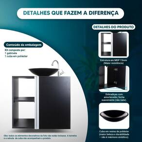 Produto de madeira MDP 15mm com revestimento de maior resistência e durabilidade, na cor Preto. A Cuba é em Resina de Poliéster na cor Preto, material robusto, brilhante e de excelente acabamento, não é mármore sintético e nem plástico. Muito linda e elegante.