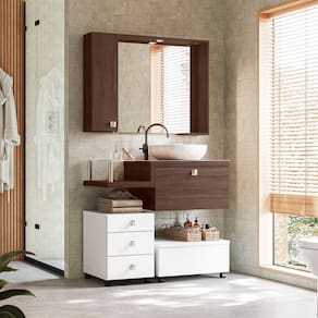 Ter o banheiro dos sonhos fica fácil com a mobília correta. Aliando elegância e praticidade, o Conjunto Armário para Banheiro Vicenza, composto por um gabinete suspenso com vidro temperado sobrepondo e espelheira com espelho e iluminação e mais gaveteiro e baú, não necessita de muito espaço para ser instalado, é fácil de limpar e dá um up na decoração de qualquer banheiro. O Conjunto Armário para Banheiro Vicenza é inspirado nas novas tendências mundiais, agregando também ótima resistência, durabilidade e qualidade com muito requinte e beleza.