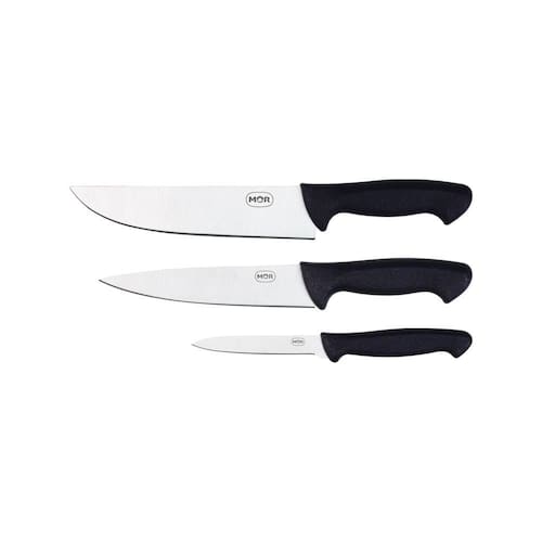 O Conjunto Assador 3 Peças Mor vem com três facas de tamanhos diferentes para facilitar na hora do preparo daquele prato especial. Uma para cada ocasião. Fabricados com cabos em polipropileno preto e lâminas em aço inoxidável, são resistentes e práticas, essenciais para descomplicar a rotina de qualquer cozinha.