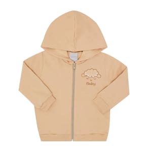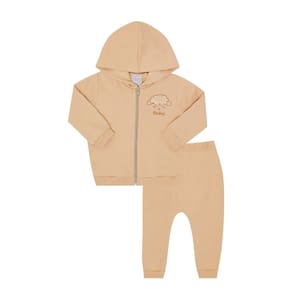 Estiloso e muito confortável, o conjunto em moletom na cor avelã conta com jaqueta que possuí capuz e fecho frontal, o detalhe destaque da peça é o bordado de ovelha na frente da jaqueta. A calça conta com elastano na cintura e seu detalhe fica para o bordado de ovelha na parte das costas da calça.\n