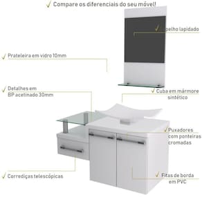 Conjunto Balcão C/cuba F44 E Espelheira Legno 831 Perffect Acetinado Branco Chess C/branco Chess Sobre o ProdutoConjunto Balcão C/Cuba F44 e Espelheira Legno 831 Branco ChessDescrição do Produto:O Conjunto (Balcão + Cuba + Espelheira) Legno KTLG831 é um produto compacto, de design contemporâneo e minimalista, projetado para se encaixar no seu espaço, composto por um gabinete com gaveta lateral e tampo de apoio de vidro 10mm. A espelheira possui espelho lapidado e 01 prateleira de vidro 10mm, sendo perfeita para organizar suas coisas e fazer parte da decoração do seu linha Legno combina a leveza do branco e detalhes em vidro com tons amadeirados, conferindo uma personalidade contemporânea aos móveis de design minimalista e traços retos. Produtos que aliam funcionalidade e praticidade ao seu dia a dia são características marcantes desta coleção!Itens Inclusos:1 Conjunto Balcão C/Cuba e EspelheiraDimensões dos Produtos:Gabinete: 83 x 43 x 51 cmEspelheira: 37,5 x 11,5 x 67,5 cmCuba 43,5 x 36 x 12 cmInformações Logísticas (Comp. X Prof. X Alt.) 60 x 50,5 x 58 cm - Peso: 30,51 KgPeso Total: 30,51 KgObservações:Não acompanha acessórios decorativos. Imagens meramente ilustrativas.Informações Técnicas / Características:- Cor do Produto: Branco Chess- Cor do Predominante: Branco- Marca: Compace- Modelo: KTLG831- Linha: Legno- Material: Mdp - Acabamento: Perffect Acetinado- Escala de Brilho: Fosco- Fita de Borda: Pvc- Possui Portas: 2- Tipo de Porta: Bater- Tipo da Dobradiça: Metálica- Possui Gavetas: 1- Tipo da Corrediça: Telescópica- Possui Chave: Não- Peso Máximo por Gaveta: 3 kg- Material do Puxador: Abs- Possui Prateleiras: 2- Peso Máximo por Prateleira: 1 kg Espelheira / 4 kg Balcão- Possui Pés: Não, suspenso - Possui Espelho: Sim- Possui Vidro: Sim- Acompanha Cuba / Lavatório: Sim, de Mármore Sintético- Furação para Cuba / Lavatório: Não- Tipo da Cuba: Apoio- Cor da Cuba: Branca- Suporta Até (kg): 20 kg - Peso Lí.: 28,55Kg- Recomendações de Uso, Manutenção e Limpeza: Para a limpeza, utilize flanela seca ou pano macio levemente umedecido em água. Utilize um pano seco em seguida. Evite com produtos químicos (solventes, thinner, acetona, etc) e não utilize nenhum tipo de esponja de aço.- Necessita de Montagem: Sim / Acompanha Manual de Montagem- Complexidade da Montagem: Média: pode ser montado por mais de uma pessoa e/ou necessite de maior conhecimento para montagem.- Garantia: 6 meses Material: Mdp | Acabamento: Perffect Acetinado | Escala de Brilho: Fosco | Fita de Borda: Pvc | Possui Portas: 2 | Tipo de Porta: Bater | Tipo da Dobradiça: Metálica | Limite de unidades por venda: É possível comprar até 1 unidade por venda. | Comprimento: 83 | Largura: 43 | Quantidade máxima de pedido: 1 | Altura: 51 | Profundidade: 43 | Preço tabelado: 555 | Cor: Multicolorido | Certificação de teste externa: Não Aplicável | Baterias são necessárias?: false | Palavras-chave de Pesquisa: Não aplicável | Fonte de energia: Não aplicável | Fabricante: Compace | Componentes incluídos: | Principais Características do Produto 2: | Is Fragile: | Dimensões do item P x L x A: | Principais Características do Produto 0: | Principais Características do Produto 1: | Peso do item: | da peça: | Exige montagem: | Quantidade de itens: | de caixas: | do modelo: Cor: Branco Chess C/Branco Chess