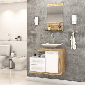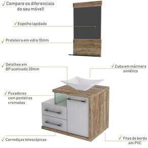 Sobre o ProdutoConjunto Balcão C/Cuba L38 e Espelheira Legno 651 Branco ChessDescrição do Produto:O Conjunto (Balcão + Cuba + Espelheira) Legno KTLG651 é um produto compacto, de design contemporâneo e minimalista, projetado para se encaixar no seu espaço, composto por um gabinete com cuba de apoio, 02 gavetas laterais e detalhe em vidro 10mm. A espelheira possui espelho lapidado e 01 prateleira de vidro 10mm, sendo perfeita para organizar suas coisas e fazer parte da decoração do seu linha Legno combina a leveza do branco e detalhes em vidro com tons amadeirados, conferindo uma personalidade contemporânea aos móveis de design minimalista e traços retos. Produtos que aliam funcionalidade e praticidade ao seu dia a dia são características marcantes desta coleção!Itens Inclusos:1 Conjunto Balcão C/Cuba e EspelheiraDimensões dos Produtos:Gabinete: 65 x 45 x 50 cmEspelheira: 37,5 x 11,5 x 67,5 cmCuba 38,5 x 33 x 11,5 cmInformações Logísticas (Comp. X Prof. X Alt.) 70 x 50 x 56 cm - Peso: 30,03 KgPeso Total: 30,03 KgObservações:Não acompanha acessórios decorativos. Imagens meramente ilustrativas.Informações Técnicas / Características:- Cor do Produto: Branco Chess- Cor do Predominante: Branco- Marca: Compace- Modelo: KTLG651- Linha: Legno- Material: Mdp - Acabamento: Perffect Acetinado- Escala de Brilho: Fosco- Fita de Borda: Pvc- Possui Portas: 1- Tipo de Porta: Bater- Tipo da Dobradiça: Metálica- Possui Gavetas: 2- Tipo da Corrediça: Telescópica- Possui Chave: Não- Peso Máximo por Gaveta: 3 kg- Material do Puxador: Abs- Possui Prateleiras: 1 - Possui Pés: Não, suspenso - Possui Espelho: Sim- Possui Vidro: Sim- Acompanha Cuba / Lavatório: Sim, de Mármore Sintético- Furação para Cuba / Lavatório: Não- Tipo da Cuba: Apoio- Cor da Cuba: Branca- Suporta Até (kg): 20 kg - Peso Lí.: 27,95Kg- Recomendações de Uso, Manutenção e Limpeza: Para a limpeza, utilize flanela seca ou pano macio levemente umedecido em água. Utilize um pano seco em seguida. Evite com produtos químicos (solventes, thinner, acetona, etc) e não utilize nenhum tipo de esponja de aço.- Necessita de Montagem: Sim / Acompanha Manual de Montagem- Complexidade da Montagem: Média: pode ser montado por mais de uma pessoa e/ou necessite de maior conhecimento para montagem.- Garantia: 6 meses Material: Mdp | Acabamento: Perffect Acetinado | Escala de Brilho: Fosco | Fita de Borda: Pvc | Possui Portas: 1 | Tipo de Porta: Bater | Tipo da Dobradiça: Metálica | Limite de unidades por venda: É possível comprar até 1 unidade por venda. | Tipo de Produto: Gabinete de banheiro | Fabricante: Compace | Quantidade máxima de pedido: 1 | Comprimento: 65 | Largura: 45 | Altura: 53 | Profundidade: 45 | Preço tabelado: 549 | Cor: Multicolorido | Certificação de teste externa: Não Aplicável | Baterias são necessárias?: false | Palavras-chave de Pesquisa: Não aplicável | Fonte de energia: Não aplicável | Peso do item: | Componentes incluídos: | Principais Características do Produto 2: | Exige montagem: | da peça: | Principais Características do Produto 1: | Dimensões do item P x L x A: | Is Fragile: | Principais Características do Produto 0: | Quantidade de itens: | do modelo: | de caixas: Cor: Branco Chess C/Carvalho