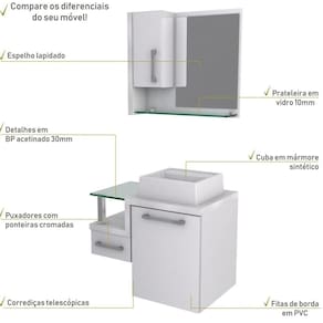 Conjunto Balcão C/cuba Q32 E Espelheira Legno 630 Perffect Acetinado Branco Chess C/branco Chess Sobre o ProdutoConjunto Balcão C/Cuba L34 Legno 630 Perffect AcetinadoDescrição do Produto:O Conjunto Balcão C/Cuba Legno 630 é um produto compacto, de design contemporâneo e minimalista, projetado para se encaixar no seu espaço, composto por um gabinete com gaveta lateral e tampo de apoio de vidro 10mm, além da cuba, sendo perfeito para organizar suas coisas e fazer parte da decoração do seu linha Legno combina a leveza do branco e detalhes em vidro com tons amadeirados, conferindo uma personalidade contemporânea aos móveis de design minimalista e traços retos. Produtos que aliam funcionalidade e praticidade ao seu dia a dia são características marcantes desta coleção!Itens Inclusos:1 Conjunto Balcão C/CubaDimensões dos Produtos:O Gabinete Legno 630 GTLG630 possui 01 porta e 01 gaveta lateral, além do tampo de apoio em vidro 10mm.: x 65 x 43 cmCuba 34,5 x 34,5 x 11,5 cmInformações Logísticas (Comp. X Prof. X Alt.) 47 x 47 x 55 cm - Peso: 23,1 KgPeso Total: 23,1 KgObservações:Não acompanha acessórios decorativos. Imagens meramente ilustrativas.Informações Técnicas / Características:- Cor do Produto: Perffect Acetinado- Cor do Predominante: Branco- Marca: Compace- Modelo: GCLG630- Linha: Legno- Material: Mdp - Acabamento: Perffect Acetinado- Escala de Brilho: Fosco- Fita de Borda: Pvc- Possui Portas: 1- Tipo de Porta: Bater- Tipo da Dobradiça: Metálica- Possui Gavetas: 1- Tipo da Corrediça: Telescópica- Possui Chave: Não- Peso Máximo por Gaveta: 3 kg- Material do Puxador: Abs- Possui Prateleiras: 1- Peso Máximo por Prateleira: 4 kg- Possui Pés: Não, suspenso - Possui Espelho: Não- Possui Vidro: Sim- Acompanha Cuba / Lavatório: Sim, de Mármore Sintético- Furação para Cuba / Lavatório: Não- Tipo da Cuba: Apoio- Cor da Cuba: Branca- Suporta Até (kg): 19 kg - Peso Lí.: 40,09Kg- Recomendações de Uso, Manutenção e Limpeza: Para a limpeza, utilize flanela seca ou pano macio levemente umedecido em água. Utilize um pano seco em seguida. Evite com produtos químicos (solventes, thinner, acetona, etc) e não utilize nenhum tipo de esponja de aço.- Necessita de Montagem: Sim / Acompanha Manual de Montagem- Complexidade da Montagem: Média: pode ser montado por mais de uma pessoa e/ou necessite de maior conhecimento para montagem.- Garantia: 6 meses Material: Mdp | Acabamento: Perffect Acetinado | Escala de Brilho: Fosco | Fita de Borda: Pvc | Possui Portas: 2 | Tipo de Porta: Bater | Tipo da Dobradiça: Metálica | Comprimento: 65 | Limite de unidades por venda: É possível comprar até 1 unidade por venda. | Quantidade máxima de pedido: 1 | Largura: 43 | Altura: 50 | Profundidade: 43 | Preço tabelado: | Cor: Multicolorido | Certificação de teste externa: Não Aplicável | Baterias são necessárias?: false | Palavras-chave de Pesquisa: Não aplicável | Fonte de energia: Não aplicável | Fabricante: Compace | Exige montagem: | Peso do item: | Componentes incluídos: | Principais Características do Produto 1: | Dimensões do item P x L x A: | Principais Características do Produto 0: | Is Fragile: | Principais Características do Produto 2: | da peça: | do modelo: | de caixas: | Quantidade de itens: Cor: Branco Chess C/Branco Chess