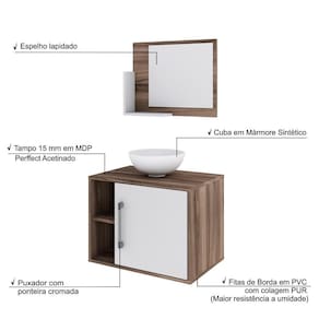 Sobre o ProdutoConjunto Balcão C/Cuba R30 e Espelheira Soft 600 Branco ChessDescrição do Produto:O Conjunto Balcão C/Cuba e Espelheira Soft 600 KTSF600 tem design compacto, perfeito para pequenos espaços, conta com uma prateleira lateral e uma cuba de apoio, além da linha Basic traz móveis funcionais e de design tradicional, aliando simplicidade e estilo para seu ambiente de banheiro!Itens Inclusos:1 Conjunto Balcão C/Cuba e EspelheiraDimensões dos Produtos:Gabinete: 60 x 40 x 45 cmEspelheira: 53 x 10,5 x 42 cmCuba 30,5 x 30,5 x 12,5 cmInformações Logísticas (Comp. X Prof. X Alt.) 64 x 45 x 26 cm - Peso: 20,14 KgPeso Total: 20,14 KgObservações:Não acompanha acessórios decorativos. Imagens meramente ilustrativas.Informações Técnicas / Características:- Cor do Produto: Branco Chess- Cor do Predominante: Branco- Marca: Compace- Modelo: KTSF600- Linha: Basic- Material: Mdp - Acabamento: Perffect Acetinado- Escala de Brilho: Fosco- Fita de Borda: Pvc- Possui Portas: 1- Tipo de Porta: Bater- Tipo da Dobradiça: Metálica - Material do Puxador: Abs- Possui Prateleiras: 2- Peso Máximo por Prateleira: 1 kg Espelheira / 3 kg Balcão- Possui Pés: Não, suspenso - Possui Espelho: Sim- Possui Vidro: Sim- Acompanha Cuba / Lavatório: Sim, de Mármore Sintético- Furação para Cuba / Lavatório: Não- Tipo da Cuba: Apoio- Cor da Cuba: Branca- Suporta Até (kg): 16 kg - Peso Lí.: 18,72Kg- Recomendações de Uso, Manutenção e Limpeza: Para a limpeza, utilize flanela seca ou pano macio levemente umedecido em água. Utilize um pano seco em seguida. Evite com produtos químicos (solventes, thinner, acetona, etc) e não utilize nenhum tipo de esponja de aço.- Necessita de Montagem: Sim / Acompanha Manual de Montagem- Complexidade da Montagem: Média: pode ser montado por mais de uma pessoa e/ou necessite de maior conhecimento para montagem.- Garantia: 6 meses Material: Mdp | Acabamento: Perffect Acetinado | Escala de Brilho: Fosco | Fita de Borda: Pvc | Possui Portas: 1 | Tipo de Porta: Bater | Tipo da Dobradiça: Metálica | Limite de unidades por venda: É possível comprar até 1 unidade por venda. | Comprimento: 60 | Largura: 40 | Quantidade máxima de pedido: 1 | Altura: 45 | Profundidade: 40 | Preço Tabelado: | Cor: Multicolorido | Certificação de teste externa: Não Aplicável | Baterias são necessárias?: false | Palavras-chave de Pesquisa: Não aplicável | Fonte de energia: Não aplicável | Fabricante: Compace | Principais Características do Produto 0: | Dimensões do item P x L x A: | Exige montagem: | Is Fragile: | Principais Características do Produto 2: | da peça: | Principais Características do Produto 1: | Componentes incluídos: | Peso do item: | do modelo: | de caixas: | Quantidade de itens: Cor: Nogal C/Branco Chess