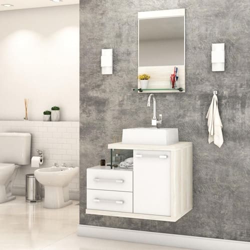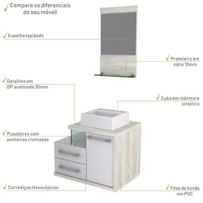 Sobre o ProdutoConjunto Balcão C/Cuba Q32 e Espelheira Legno 651 Branco ChessDescrição do Produto:O Conjunto (Balcão + Cuba + Espelheira) Legno KTLG651 é um produto compacto, de design contemporâneo e minimalista, projetado para se encaixar no seu espaço, composto por um gabinete com cuba de apoio, 02 gavetas laterais e detalhe em vidro 10mm. A espelheira possui espelho lapidado e 01 prateleira de vidro 10mm, sendo perfeita para organizar suas coisas e fazer parte da decoração do seu linha Legno combina a leveza do branco e detalhes em vidro com tons amadeirados, conferindo uma personalidade contemporânea aos móveis de design minimalista e traços retos. Produtos que aliam funcionalidade e praticidade ao seu dia a dia são características marcantes desta coleção!Itens Inclusos:1 Conjunto Balcão C/Cuba e EspelheiraDimensões dos Produtos:Gabinete: 65 x 45 x 50 cmEspelheira: 37,5 x 11,5 x 67,5 cmCuba 33 x 30 x 10 cmInformações Logísticas (Comp. X Prof. X Alt.) 70 x 50 x 56 cm - Peso: 30,62 KgPeso Total: 30,62 KgObservações:Não acompanha acessórios decorativos. Imagens meramente ilustrativas.Informações Técnicas / Características:- Cor do Produto: Branco Chess- Cor do Predominante: Branco- Marca: Compace- Modelo: KTLG651- Linha: Legno- Material: Mdp - Acabamento: Perffect Acetinado- Escala de Brilho: Fosco- Fita de Borda: Pvc- Possui Portas: 1- Tipo de Porta: Bater- Tipo da Dobradiça: Metálica- Possui Gavetas: 2- Tipo da Corrediça: Telescópica- Possui Chave: Não- Peso Máximo por Gaveta: 3 kg- Material do Puxador: Abs- Possui Prateleiras: 1 - Possui Pés: Não, suspenso - Possui Espelho: Sim- Possui Vidro: Sim- Acompanha Cuba / Lavatório: Sim, de Mármore Sintético- Furação para Cuba / Lavatório: Não- Tipo da Cuba: Apoio- Cor da Cuba: Branca- Suporta Até (kg): 20 kg - Peso Lí.: 28,54Kg- Recomendações de Uso, Manutenção e Limpeza: Para a limpeza, utilize flanela seca ou pano macio levemente umedecido em água. Utilize um pano seco em seguida. Evite com produtos químicos (solventes, thinner, acetona, etc) e não utilize nenhum tipo de esponja de aço.- Necessita de Montagem: Sim / Acompanha Manual de Montagem- Complexidade da Montagem: Média: pode ser montado por mais de uma pessoa e/ou necessite de maior conhecimento para montagem.- Garantia: 6 meses Material: Mdp | Acabamento: Perffect Acetinado | Escala de Brilho: Fosco | Fita de Borda: Pvc | Possui Portas: 1 | Tipo de Porta: Bater | Tipo da Dobradiça: Metálica | Tipo de Produto: Gabinete de Banheiro | Fabricante: Compace | Limite de unidades por venda: É possível comprar até 1 unidade por venda. | Quantidade máxima de pedido: 1 | Comprimento: 65 | Largura: 45 | Altura: 53 | Profundidade: 43 | Preço tabelado: | Cor: Multicolorido | Certificação de teste externa: Não Aplicável | Baterias são necessárias?: false | Palavras-chave de Pesquisa: Não aplicável | Fonte de energia: Não aplicável | Componentes incluídos: | Principais Características do Produto 1: | Dimensões do item P x L x A: | Is Fragile: | Exige montagem: | da peça: | Principais Características do Produto 0: | Principais Características do Produto 2: | Peso do item: | do modelo: | de caixas: | Quantidade de itens: Cor: Branco Chess C/Snow