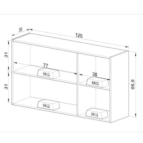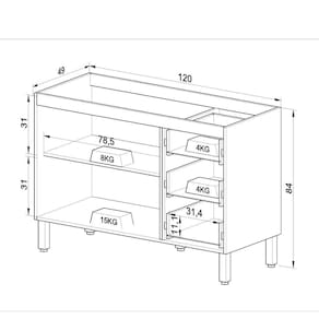 As dimensões estão expressas na seguinte forma - Largura x Altura e Profundidade em cm. O peso suportado considera a carga distribuída igualmente pela peça.