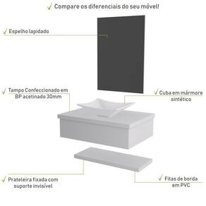 Sobre o ProdutoConjunto Bancada C/Cuba L30, Prateleira e Espelheira Metrópole 606 Branco ChessDescrição do Produto:O Conjunto (Bancada + Cuba + Espelheira + Prateleira) Metrópole KTME606 é um produto compacto de design simples e moderno, projetado para pequenos espaços, perfeito para fazer parte da decoração do seu lavabo ou banheiro. Conta com uma cuba de apoio, uma espelheira e prateleira com pinos invisíveis, além do suporte linha Metrópole é uma coleção de móveis modernos e com inúmeras possibilidades de composições, combinando design contemporâneo e muita funcionalidade. Diversas possibilidades de cores e modelos de cubas formam uma solução perfeita para as mais opções de decoração e projetos em ambientes de banheiro. É você quem decide!!!Itens Inclusos:1 Conjunto Bancada C/Cuba, Prateleira e EspelheiraDimensões dos Produtos:Bancada: 60 x 43 x 19 cmEspelheira: 43 x 1,8 x 60 cmCuba 29,8 x 29,8 x 11,5 cmInformações Logísticas (Comp. X Prof. X Alt.) 63 x 47 x 26 cm - Peso: 17,68 KgPeso Total: 17,68 KgObservações:Não acompanha acessórios decorativos. Imagens meramente ilustrativas.Informações Técnicas / Características:- Cor do Produto: Branco Chess- Cor do Predominante: Branco- Marca: Compace- Modelo: KTME606- Linha: Metrópole- Material: Mdp - Acabamento: Perffect Acetinado- Escala de Brilho: Fosco- Fita de Borda: Pvc - Possui Gavetas: Não - Material do Puxador: Alumínio- Possui Prateleiras: 1- Peso Máximo por Prateleira: 02 kg- Possui Pés: Não, suspenso - Possui Espelho: Sim - Acompanha Cuba / Lavatório: Sim, de Mármore Sintético- Furação para Cuba / Lavatório: Não- Tipo da Cuba: Apoio- Cor da Cuba: Branca- Suporta Até (kg): 12 kg - Peso Lí.: 16,78Kg- Recomendações de Uso, Manutenção e Limpeza: Para a limpeza, utilize flanela seca ou pano macio levemente umedecido em água. Utilize um pano seco em seguida. Evite com produtos químicos (solventes, thinner, acetona, etc) e não utilize nenhum tipo de esponja de aço.- Necessita de Montagem: Sim / Acompanha Manual de Montagem- Complexidade da Montagem: Média: pode ser montado por mais de uma pessoa e/ou necessite de maior conhecimento para montagem.- Garantia: 6 meses- Outras Características: Montagem ível, o suporte toalheiro pode ser montado em qualquer um dos lados. Material: Mdp | Acabamento: Perffect Acetinado | Escala de Brilho: Fosco | Fita de Borda: Pvc | Comprimento: 60 | Largura: 42 | Altura: 19 | Profundidade: 42 | Limite de unidades por venda: É possível comprar até 1 unidade por venda. | Quantidade máxima de pedido: 1 | Preço tabelado: 339 | Cor: Multicolorido | Certificação de teste externa: Não Aplicável | Baterias são necessárias?: false | Palavras-chave de Pesquisa: Não aplicável | Fonte de energia: Não aplicável | Fabricante: Compace | Is Fragile: | Peso do item: | Exige montagem: | Principais Características do Produto 2: | da peça: | Componentes incluídos: | Dimensões do item P x L x A: | Principais Características do Produto 1: | Principais Características do Produto 0: | do modelo: | de caixas: | Quantidade de itens: Cor: Branco Chess