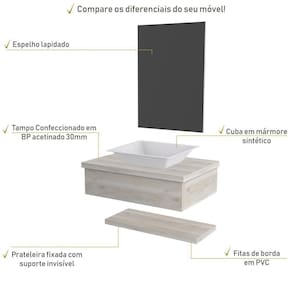 Sobre o ProdutoConjunto Bancada C/Cuba Messina, Prateleira e Espelheira Metrópole 606 Branco ChessDescrição do Produto:O Conjunto (Bancada + Cuba + Espelheira + Prateleira) Metrópole KTME606 é um produto compacto de design simples e moderno, projetado para pequenos espaços, perfeito para fazer parte da decoração do seu lavabo ou banheiro. Conta com uma cuba de apoio, uma espelheira e prateleira com pinos invisíveis, além do suporte linha Metrópole é uma coleção de móveis modernos e com inúmeras possibilidades de composições, combinando design contemporâneo e muita funcionalidade. Diversas possibilidades de cores e modelos de cubas formam uma solução perfeita para as mais opções de decoração e projetos em ambientes de banheiro. É você quem decide!!!Itens Inclusos:1 Conjunto Bancada C/Cuba, Prateleira e EspelheiraDimensões dos Produtos:Bancada: 60 x 43 x 19 cmEspelheira: 43 x 1,8 x 60 cmCuba 44,5 x 35 x 10 cmInformações Logísticas (Comp. X Prof. X Alt.) 63 x 47 x 26 cm - Peso: 20,23 KgPeso Total: 20,23 KgObservações:Não acompanha acessórios decorativos. Imagens meramente ilustrativas.Informações Técnicas / Características:- Cor do Produto: Branco Chess- Cor do Predominante: Branco- Marca: Compace- Modelo: KTME606- Linha: Metrópole- Material: Mdp - Acabamento: Perffect Acetinado- Escala de Brilho: Fosco- Fita de Borda: Pvc - Possui Gavetas: Não - Material do Puxador: Alumínio- Possui Prateleiras: 1- Peso Máximo por Prateleira: 02 kg- Possui Pés: Não, suspenso - Possui Espelho: Sim - Acompanha Cuba / Lavatório: Sim, de Mármore Sintético- Furação para Cuba / Lavatório: Não- Tipo da Cuba: Apoio- Cor da Cuba: Branca- Suporta Até (kg): 12 kg - Peso Lí.: 19,33Kg- Recomendações de Uso, Manutenção e Limpeza: Para a limpeza, utilize flanela seca ou pano macio levemente umedecido em água. Utilize um pano seco em seguida. Evite com produtos químicos (solventes, thinner, acetona, etc) e não utilize nenhum tipo de esponja de aço.- Necessita de Montagem: Sim / Acompanha Manual de Montagem- Complexidade da Montagem: Média: pode ser montado por mais de uma pessoa e/ou necessite de maior conhecimento para montagem.- Garantia: 6 meses- Outras Características: Montagem ível, o suporte toalheiro pode ser montado em qualquer um dos lados. Material: Mdp | Acabamento: Perffect Acetinado | Escala de Brilho: Fosco | Fita de Borda: Pvc | Tipo de Produto: Bancada para Banheiro | Fabricante: Compace | Comprimento: 60 | Limite de unidades por venda: É possível comprar até 1 unidade por venda. | Largura: 42 | Quantidade máxima de pedido: 1 | Altura: 19 | Profundidade: 42 | Preço tabelado: | Cor: Multicolorido | Certificação de teste externa: Não Aplicável | Baterias são necessárias?: false | Palavras-chave de Pesquisa: Não aplicável | Fonte de energia: Não aplicável | da peça: | Peso do item: | Principais Características do Produto 2: | Componentes incluídos: | Exige montagem: | Principais Características do Produto 1: | Principais Características do Produto 0: | Is Fragile: | Dimensões do item P x L x A: | do modelo: | Quantidade de itens: | de caixas: Cor: Snow