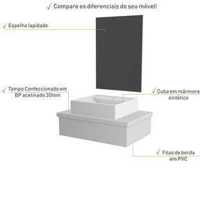 Conjunto Bancada C/cuba Q39 E Espelheira Metrópole 601 Perffect Acetinado Branco Chess Sobre o ProdutoConjunto Bancada C/Cuba Q39 e Espelheira Metrópole 601 Branco ChessDescrição do Produto:O Conjunto (Bancada + Cuba + Espelheira) Metrópole KTME601 é um produto compacto de design simples e moderno, projetado para pequenos espaços, perfeito para fazer parte da decoração do seu lavabo ou banheiro. Conta com uma cuba de apoio e uma espelheira com espelho lapidado, além do suporte linha Metrópole é uma coleção de móveis modernos e com inúmeras possibilidades de composições, combinando design contemporâneo e muita funcionalidade. Diversas possibilidades de cores e modelos de cubas formam uma solução perfeita para as mais opções de decoração e projetos em ambientes de banheiro. É você quem decide!!!Itens Inclusos:1 Conjunto Bancada C/Cuba e EspelheiraDimensões dos Produtos:Bancada: 60 x 43 x 19 cmEspelheira: 43 x 1,8 x 60 cmCuba 40 x 37,5 x 10 cmInformações Logísticas (Comp. X Prof. X Alt.) 63 x 47 x 26 cm - Peso: 17,84 KgPeso Total: 17,84 KgObservações:Não acompanha acessórios decorativos. Imagens meramente ilustrativas.Informações Técnicas / Características:- Cor do Produto: Branco Chess- Cor do Predominante: Branco- Marca: Compace- Modelo: KTME601- Linha: Metrópole- Material: Mdp - Acabamento: Perffect Acetinado- Escala de Brilho: Fosco- Fita de Borda: Pvc - Possui Gavetas: Não - Material do Puxador: Alumínio - Possui Pés: Não, suspenso - Possui Espelho: Sim - Acompanha Cuba / Lavatório: Sim, de Mármore Sintético- Furação para Cuba / Lavatório: Não- Tipo da Cuba: Apoio- Cor da Cuba: Branca- Suporta Até (kg): 10 kg - Peso Lí.: 16,94Kg- Recomendações de Uso, Manutenção e Limpeza: Para a limpeza, utilize flanela seca ou pano macio levemente umedecido em água. Utilize um pano seco em seguida. Evite com produtos químicos (solventes, thinner, acetona, etc) e não utilize nenhum tipo de esponja de aço.- Necessita de Montagem: Sim / Acompanha Manual de Montagem- Complexidade da Montagem: Média: pode ser montado por mais de uma pessoa e/ou necessite de maior conhecimento para montagem.- Garantia: 6 meses- Outras Características: Montagem ível, o suporte toalheiro pode ser montado em qualquer um dos lados. Material: Mdp | Acabamento: Perffect Acetinado | Escala de Brilho: Fosco | Fita de Borda: Pvc | Tipo de Produto: Bancada para Banheiro | Fabricante: Compace | Comprimento: 60 | Limite de unidades por venda: É possível comprar até 1 unidade por venda. | Largura: 42 | Quantidade máxima de pedido: 1 | Altura: 19 | Profundidade: 42 | Preço tabelado: | Cor: Multicolorido | Certificação de teste externa: Não Aplicável | Baterias são necessárias?: false | Palavras-chave de Pesquisa: Não aplicável | Fonte de energia: Não aplicável | Peso do item: | da peça: | Principais Características do Produto 2: | Componentes incluídos: | Principais Características do Produto 0: | Dimensões do item P x L x A: | Principais Características do Produto 1: | Is Fragile: | Exige montagem: | Quantidade de itens: | do modelo: | de caixas: Cor: Branco Chess