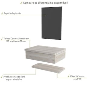 Sobre o ProdutoConjunto Bancada, Prateleira e Espelheira KTME607 Branco ChessDescrição do Produto:O Conjunto (Bancada + Espelheira + Prateleira) Metrópole KTME607 é um produto compacto de design simples e moderno, projetado para pequenos espaços, perfeito para fazer parte da decoração do seu lavabo ou banheiro. Conta uma espelheira e prateleira com pinos invisíveis, além do suporte linha Metrópole é uma coleção de móveis modernos e com inúmeras possibilidades de composições, combinando design contemporâneo e muita funcionalidade. Diversas possibilidades de cores e modelos de cubas formam uma solução perfeita para as mais opções de decoração e projetos em ambientes de banheiro. É você quem decide!!!Itens Inclusos:1 Conjunto Bancada, Prateleira e EspelheiraDimensões dos Produtos:Bancada: 60 x 43 x 19 cmEspelheira: 43 x 1,8 x 60 cm: Informações Logísticas (Comp. X Prof. X Alt.) 63 x 47 x 26 cm - Peso: 15,18 KgPeso Total: 15,18 KgObservações:Não acompanha acessórios decorativos. Imagens meramente ilustrativas.Informações Técnicas / Características:- Cor do Produto: Branco Chess- Cor do Predominante: Branco- Marca: Compace- Modelo: KTME607- Linha: Metrópole- Material: Mdp - Acabamento: Perffect Acetinado- Escala de Brilho: Fosco- Fita de Borda: Pvc - Possui Gavetas: Não - Material do Puxador: Alumínio- Possui Prateleiras: 1- Peso Máximo por Prateleira: 02 kg- Possui Pés: Não, suspenso - Possui Espelho: Sim - Acompanha Cuba / Lavatório: Não- Furação para Cuba / Lavatório: Não - Suporta Até (kg): 12 kg - Peso Lí.: 14,28Kg- Recomendações de Uso, Manutenção e Limpeza: Para a limpeza, utilize flanela seca ou pano macio levemente umedecido em água. Utilize um pano seco em seguida. Evite com produtos químicos (solventes, thinner, acetona, etc) e não utilize nenhum tipo de esponja de aço.- Necessita de Montagem: Sim / Acompanha Manual de Montagem- Complexidade da Montagem: Média: pode ser montado por mais de uma pessoa e/ou necessite de maior conhecimento para montagem.- Garantia: 6 meses- Outras Características: Montagem ível, o suporte toalheiro pode ser montado em qualquer um dos lados. Material: Mdp | Acabamento: Perffect Acetinado | Escala de Brilho: Fosco | Fita de Borda: Pvc | Tipo de Produto: Bancada para Banheiro | Fabricante: Compace | Comprimento: 80 | Limite de unidades por venda: É possível comprar até 1 unidade por venda. | Largura: 42 | Altura: 19 | Quantidade máxima de pedido: 1 | Profundidade: 42 | Preço tabelado: 279.72000000000003 | Cor: Multicolorido | Certificação de teste externa: Não Aplicável | Baterias são necessárias?: false | Palavras-chave de Pesquisa: Não aplicável | Fonte de energia: Não aplicável | Peso do item: | Componentes incluídos: | Exige montagem: | da peça: | Principais Características do Produto 2: | Principais Características do Produto 0: | Dimensões do item P x L x A: | Principais Características do Produto 1: | Is Fragile: | do modelo: | Quantidade de itens: | de caixas: Cor: Snow
