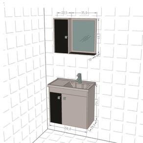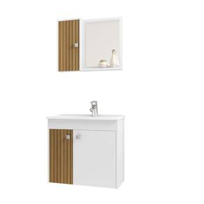 O Conjunto para Banheiro Munique composto por lavatório em mármore sintético, armário superior, espelheira e gabinete, elaborado em MDF com espessura de 12 mm. Pintura da superfície em verniz poliéster semi-brilho, com secagem UV e impressão a laser, com acabamento com textura em alto relevo, destacando os veios da madeira com cores mais próximas às naturais. Acabamento nas bordas com fita de papel decorativo aplicado mecanicamente por sistema hot melting. Puxadores de plástico com acabamento cromado, dobradiças metálicas. Ele é tudo o que falta para o seu banheiro ficar completo!