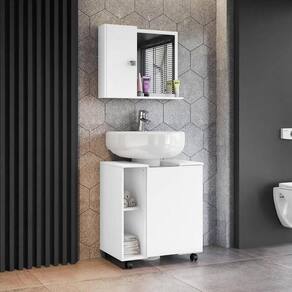 Já o Gabinete Pequim foi projetado especialmente para lavatórios de coluna, encaixando-se perfeitamente abaixo da cuba, entre a coluna. Fabricado em MDP de 12 mm, apresenta acabamento em verniz poliéster brilhante com secagem UV, impressão a laser e bordas protegidas com fita decorativa no sistema hot melting. Dispõe de 1 porta com dobradiças metálicas, 6 nichos internos que facilitam a organização e 4 rodízios, que permitem fácil movimentação sempre que necessário.