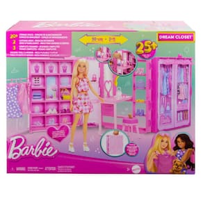 O Barbie Armário dos Sonhos está repleto de estilos e histórias infinitas que as crianças podem criar para a Barbie! Ao abrir o guarda-roupa rosa brilhante, é possível revelar um conjunto de 90 cm de largura com 2 cabides, mais de 20 espaços de armazenamento, uma penteadeira dobrável com um espelho retrátil, espelho de corpo inteiro e prateleira para sapatos Há até um travesseiro para o cachorrinho de estimação! As crianças vão adorar estilizar a boneca Barbie fashion com mais de 25 roupas e acessórios, como vestidos, sapatos, colares e bolsas em abundância