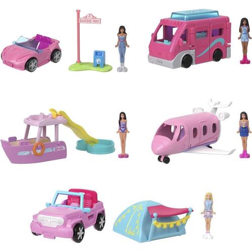 Cada conjunto inclui uma recriação em pequena escala de um veículo icônico da Barbie com um incrível momento de mudança de cor e uma boneca de 3,80 cm!
