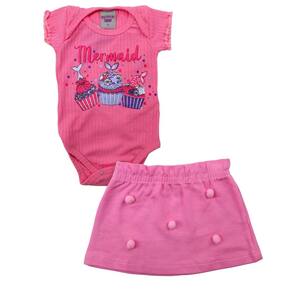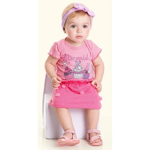 Conjunto Bebê Menina Body Canelado Estampado e Saia Rosa