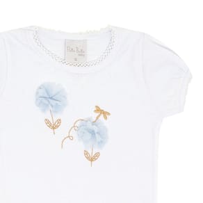 Conjuntinho que é uma gracinha! A blusa em ribana na cor branca possui elastano leve deixando o look confortável para a hora de brincar e o short saia em cotton leve na cor hortênsia possuí tule deixando o look ainda mais fofo. A blusa possuí aplique bordado e aplique de flores na parte frontal da peça.