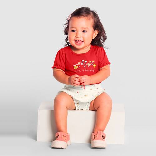 Linha: Alto Verão 2024 Faixa etária : Primeiros Passos Composição: 100% Algodão Tecido: Malha Cuidados: Não usar alvejante a base de cloro Tipo de manga: Curta Tipo de Roupa: Conjunto É esportiva: Não Tipo de gola: Redondo Tipo de cintura: Média