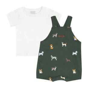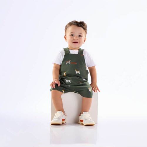 Conjuntinho jardineira ideal para um passeio tranquilo e leve com os dindos! Conjunto composto por uma jardineira militar em moletinho com estampa de animais e abertura de botões entre as pernas para facilitar a troca, movimento e o dia a dia dos pequenos e da mamãe. Acompanha também uma camiseta branca básica para complementar o look.