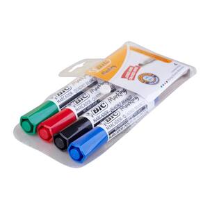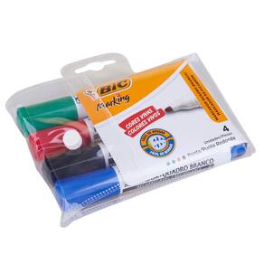 A Caneta Marcador de Quadro da Bic escreve e apaga o quadro branco com facilidade! Fácil de apagar apesar da cor da tinta ser bem viva. Sua ponta redonda é muito resistente, possibilita uma escrita firme, sem afunda. Contém 1 Marcador Azul; 1 Marcador Vermelho; 1 Marcador Preto; 1 Marcador Verde.