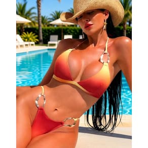 VERIFIQUE AS INFORMAÇÕES REFERENTES ÀS MEDIDAS DO PRODUTO/CORPO NESTE ANÚNCIO. ITENS DE ROUPA ÍNTIMA, LINGERIE E DE BANHO NÃO SÃO PASSÍVEIS DE TROCA/DEVOLUÇÃO. Conjunto de três Peças de Biquini Feminino Ofélia com Top Halter Decorado com Cor Degradê com Calcinha Triângulo e Saída de Praia Assimétrica. Características: Costas nuas Top halter curto Calcinha Triângulo cintura baixa Saída de Praia assimétrica Cor Degradê laranja Alças finas Saída de Praia – 95% poliéster e 5% elastano Bojo com preenchimento removível Biquini e Top com alta elasticidade – 82% poliéster e 18% elastano Música – Sina de Ofélia