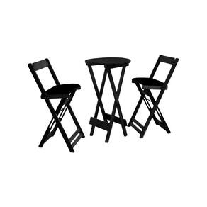 Conjunto Bistro De Madeira Dobravel Redondo 55cm Diametro Com 2 Cadeiras Preto Estofado PretoTenha maior praticidade e conforto com este conjunto bistro dobrável. Este conjunto conta com uma mesa bistrô, ideal para acomodar duplas ou casais de pessoas, juntamente com 2 cadeiras com assento estofado. Seja em restaurantes, bares, estabelecimentos comerciais, áreas de lazer ou até mesmo na sua casa, seu design permite que este conjunto seja encaixado em vários ambientes trazendo um toque estético a mais ao mesmo. Além de sua estética, este conjunto também garante uma maior praticidade de locomoção, longa durabilidade e conforto para o usuário.ATENçãO: EVITE USAR PRODUTOS ABRASIVOS E QUíMICOS PARA LIMPEZA DO PRODUTO, aconselha-se o uso de pano umedecido para melhor conservação; mantenha o produto fora de chuva e sol constantes.Matéria prima:Madeira Maciça, de alta densidade e resistente.Sua variação de tonalidades é uma característica típica desta madeira, podendo apresentar diversos tons num mesmo produto em harmonia com o brilho do verniz.Modelo: Bistro DobrávelCor:Preto c/ Preto Dimensões (Mesa): Altura 95cm / Largura 55cm / Profundidade 55cm Dimensões (Cadeiras): Altura 108cm / Largura 43cm / Profundidade 33cmConjunto Bistro de Madeira Dobravel Redondo 55cm Diametro com 2 Cadeiras Preto Estofado Preto