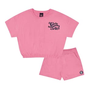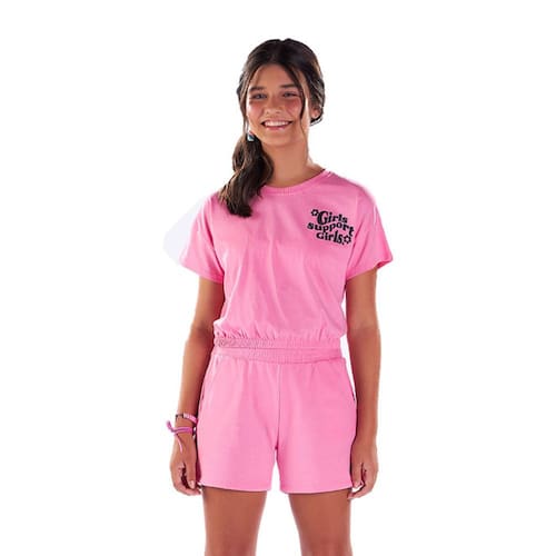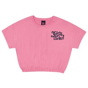 Um conjunto básico também compõe looks incríveis! Nosso conjunto garotas conta com a blusa confeccionada em tecido meia malha na cor blush com detalhe de escrita estampada no peito com a frase “girls support girls” (garotas apoiam garotas). O short confeccionado em moletinho na cor blush possui próximo a bainha etiqueta termocolante com identificação Pulla Bulla. Um conjunto desses pede por um piquenique entre amigas, não é?