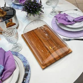 Conjunto Boleira e Migalheira com Tampas Acrílico Porta Bolo Tábua de Pão Madeira Bambu.