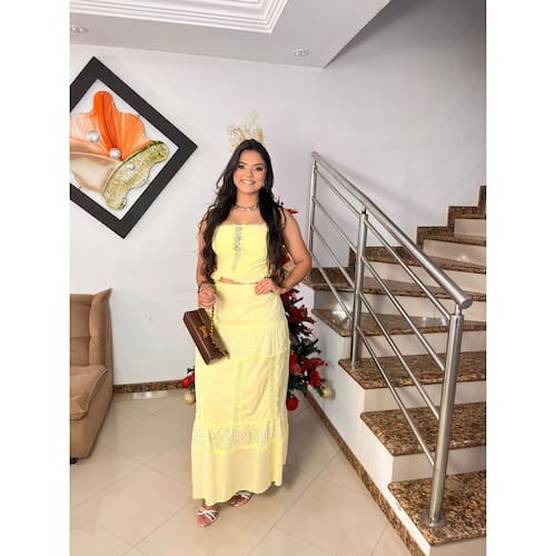 O conjunto feminino é composto por um cropped e uma saia longa. O cropped possui alças finas e detalhes em bordado. A saia longa, com comprimento até os tornozelos, apresenta recortes e babados com o mesmo detalhe em bordado, sugerindo um tecido leve como algodão, viscose ou alfaiataria, ideal para climas quentes ou ocasiões casuais e festivas. Marca: Não Informado