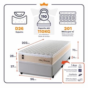 - Altura: 28 cm (colchão) + 37 cm (box baú) + 8 cm (pés) = 73 cm de altura;
