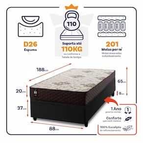 Medidas do Colchão: 88x188x20 cm, 96X203x20 cm, 138x188x20 cm, 158x198x20 cm.
