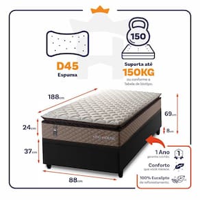 - Altura: 24 cm (colchão) + 37 cm (box baú) + 8 cm (pés) = 69 cm de altura;