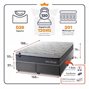 O Colchão Bento é feito com os mais nobres materiais em sua composição, ele conta com espuma D28 e molas ensacadas. Por ser mais macio, o colchão de molas ensacadas individualmente traz benefícios e ajuda no alinhamento da coluna. O colchão King House acomoda melhor o contorno do corpo, dispondo de forma correta quadris e ombros, expulsando as dores e problemas de coluna.