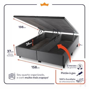 - Altura: 33 cm (colchão) + 37 cm (box baú) + 8 cm (pés) = 78 cm de altura;
