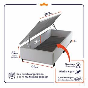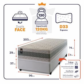 - Altura: 29 cm (colchão) + 37 cm (box baú) + 8 cm (pés) = 74 cm de altura;