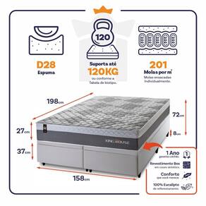 - Altura: 27 cm (colchão) + 37 cm (box baú) + 8 cm (pés) = 72 cm de altura;