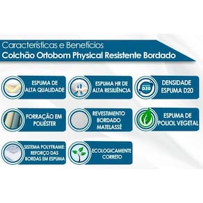Dimensões(Cm): Comprimento(Profundidade): 188cm x Largura: 138cm x Altura: 20cm Vantagens Extras de Colchão - Ecologicamente Correto - c/ Sistema Polyframe Tecido com Tratamento do Colchão - AntiÁcaro e AntiFungo Bordado do Revestimento do Colchão - Matelassê Forração Revestimento do Colchão - Poliéster Tecido de Revestimento da Faixa Lateral do Colchão - Poliéster Camadas Interna do Estofamento de Espuma do Colchão - Alta Qualidade - HR de Alta Resiliência Tipo de Espuma do Colchão - Espuma de Poliol Vegetal Densidade da Espuma do Colchão - 20 Nível de Firmeza do Colchão - Macio c/ Firmeza Peso Máximo Suportado do Colchão - 60 kg Certificação de Qualidade do Colchão - Qualidade Aprovada - INMETRO - Ecologicamente Correto Nossa Avaliação do Colchão - Qualidade Muito Boa Tempo de Garantia do Colchão - 3 meses