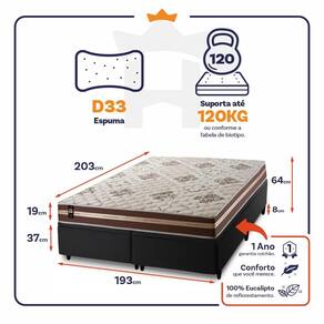 - Altura: 19 cm (colchão) + 37 cm (box baú) + 8 cm (pés) = 64 cm de altura;