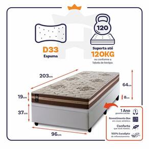 - Altura: 19 cm (colchão) + 37 cm (box baú) + 8 cm (pés) = 64 cm de altura;