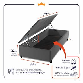 - Altura: 22 cm (colchão) + 37 cm (box baú) + 8 cm (pés) = 67 cm de altura;
