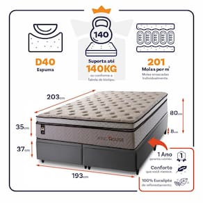 - Altura: 35 cm (colchão) + 37 cm (box baú) + 8 cm (pés) = 80 cm de altura;