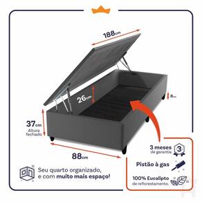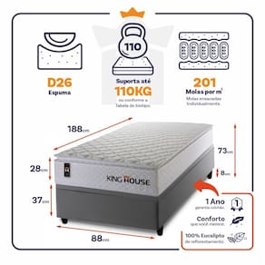- Altura: 28 cm (colchão) + 37 cm (box baú) + 8 cm (pés) = 73 cm de altura;