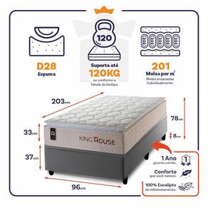 Medidas Colchão + Box: 88x188x78 cm, 96X203x78 cm, 138x188x78 cm, 158x198x78 cm, 193x203x78 cm.